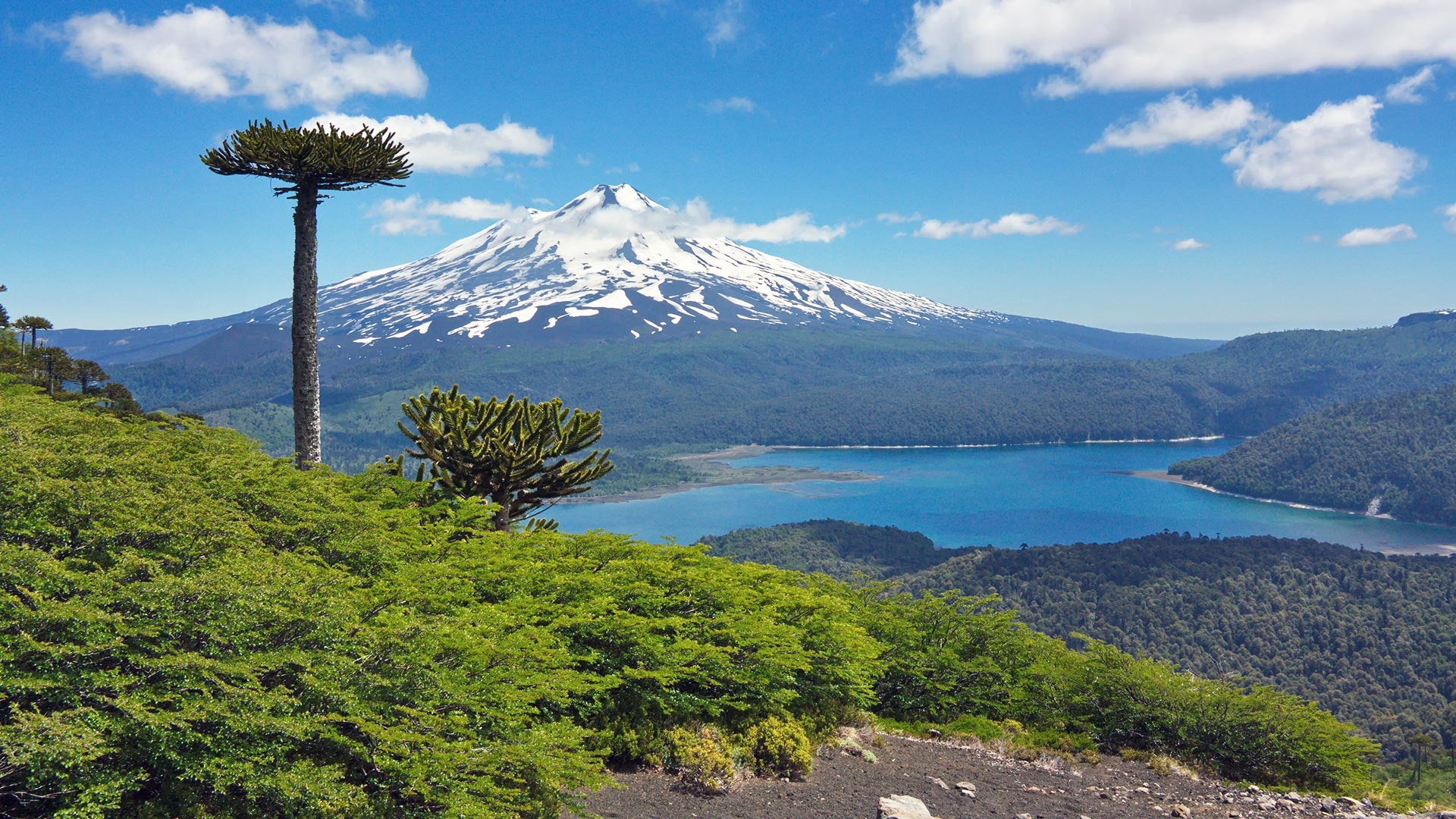 Día 1: Parque Conguillío — senderos entre araucarias y vistas al Llaima.